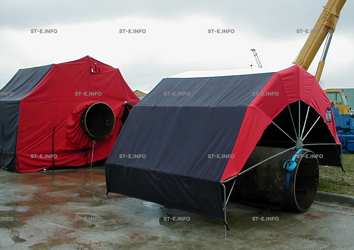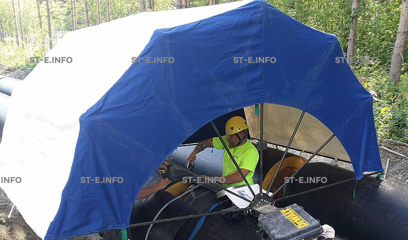 Легкое мобильное укрытие, имеющее малые транспортные размеры и вес. Используется для укрытия рабочих мест сварщиков от атмосферных осадков при сварке, зачистке и диагностике труб различных диаметров. Для удобства перемещения мобильного укрытия «Сфера» по трубопроводу основания палатки оснащены колесами.